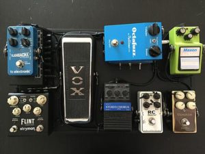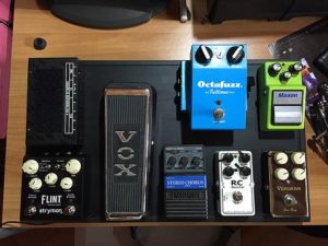 Il signal path quindi è questo: Guitar – Boss Volume Pedal – Fulltone Octafuzz – Maxon SD9 – Vemuram Jan Ray – Xotic Rc Booster – Vox Wha – Arion Chorus – MAGIC BOX – Strymon Flint – TC Flashback.