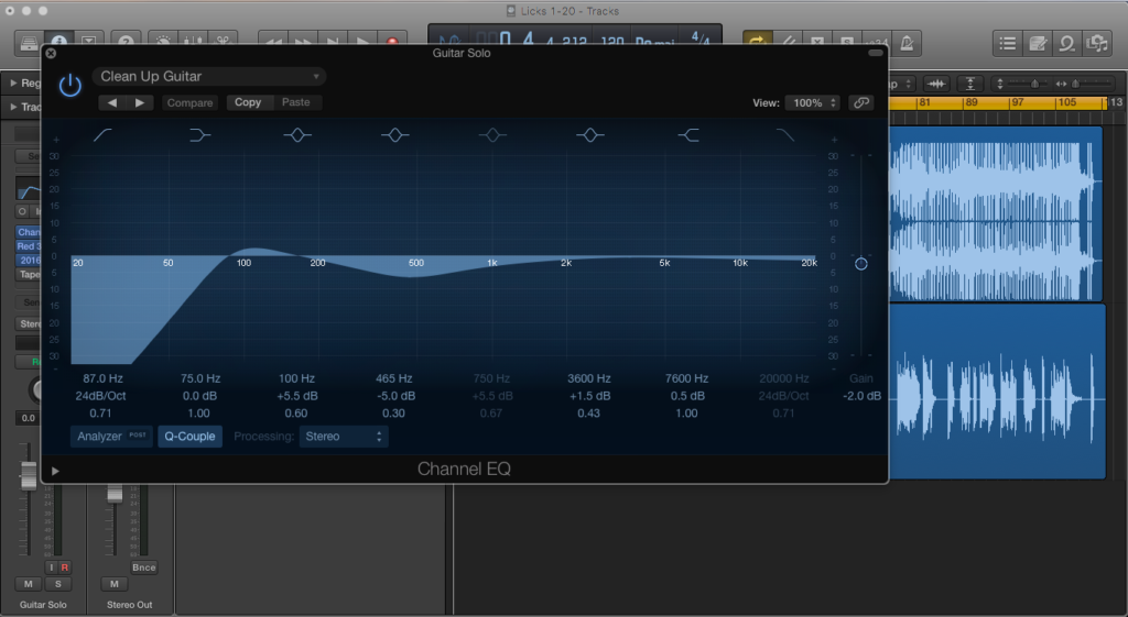 Sull’EQ in genere vado a togliere tutti i bassi inutili al mix, aggiungendo giusto 1db sui 75 Hz e togliendo un po’ sui 465 Hz. Aggiungo un pelo sui 3600 hz e sui 7600 Hz per avere un po’ di definizione all’occorrenza. Ovviemente queste sono indicazioni di massima che cambiano anche con il suono che ho scelto di registrare!
